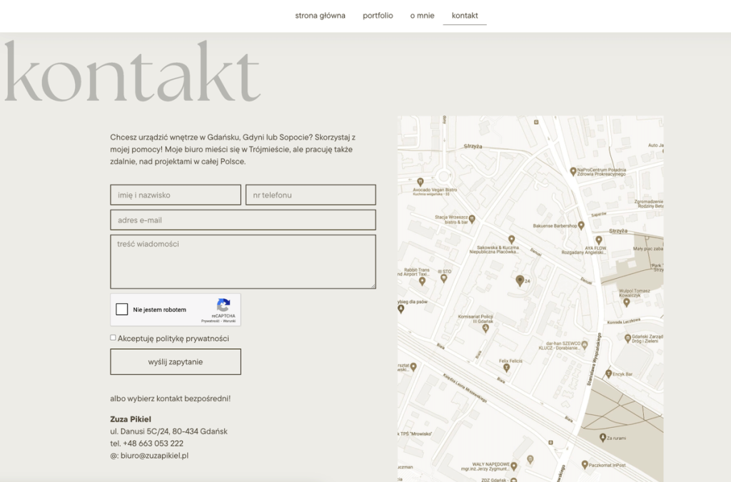 Nie ma jednego wzoru, który sprawdzi się u każdego, ale są dobre praktyki. Strona Zuzy Pikiel to przykład pięknej prostoty, który uwzględnia też lokalność biznesu. Zuza ma studio w Gdańsku, więc część klientów odwiedza ją w biurze. Obok formularza jest mapa z oznaczeniem, gdzie ma biuro, ale też zachęta do odwiedziny osobistych.