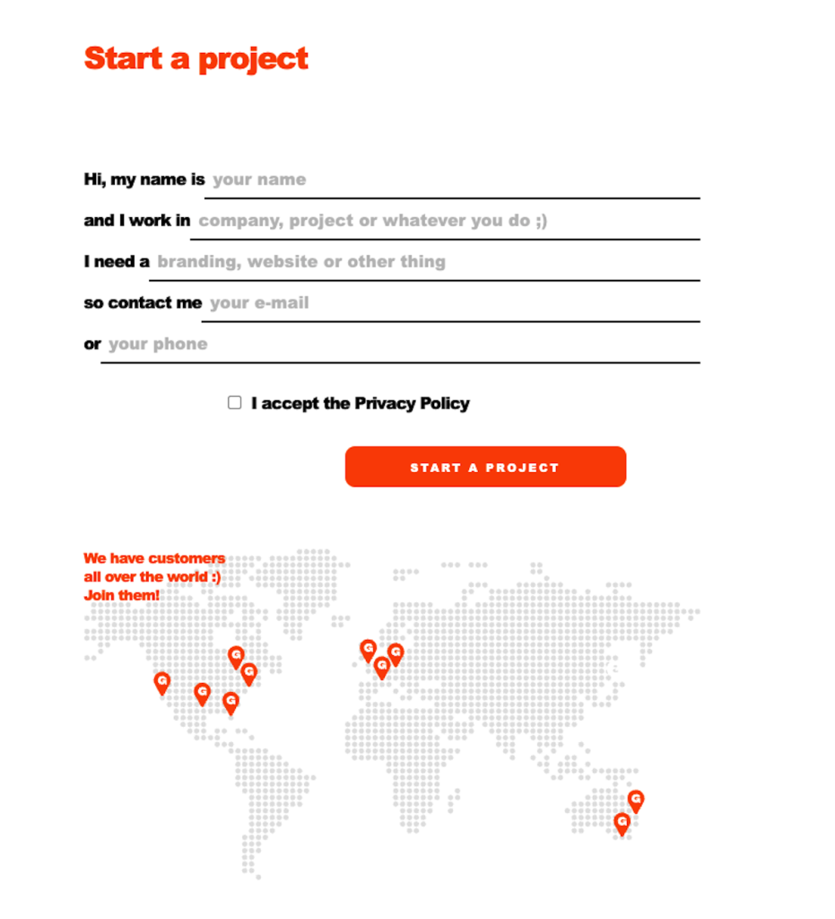- Zadbaj o kontrast. To podstawowa zasada. Cała strona Kontakt – a zwłaszcza pola formularza i przycisk – muszą mieć odpowiedni kontrast, by były czytelne dla każdego.